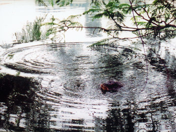 Một Cụ Rùa đang nổi trong vòng xoáy nước và ngay sát cạnh cụ này là một vòng xoáy nước to không kém |