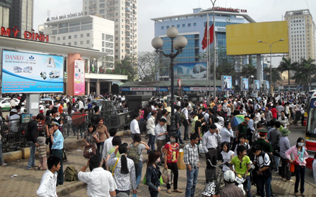 Theo tường thuật của báo Dân trí, đoàn người xe nhích từng bước, chôn chân hàng tiếng đồng hồ từ sáng sớm nay, 30/4. Từ cầu vượt Mai Dịch, xe dồn tới cổng bến Mỹ Đình thì tắc cứng. Tất cả các phương tiện chen chân nhau, khó phân biệt được đâu là đường và vỉa hè vì dòng xe máy lũ lượt “bốc” lên hè và đoàn người chờ xe đổ cả xuống lòng đường.