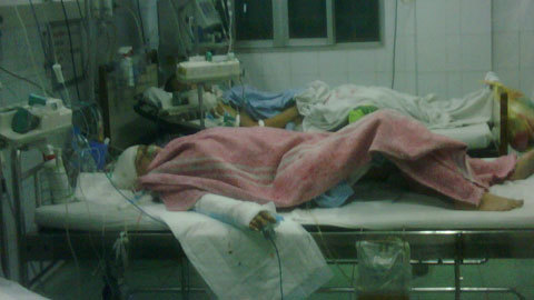 | Chị Dung (đắp chăn hồng) đang mang thai tháng thứ 6 hiện rất yếu sau khi bị chồng đâm 40 nhát |