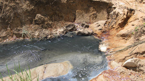 Bờ bao bãi rác được đắp bằng cát, khi mưa xuống đã bị phá vỡ làm nước rỉ rác chảy tràn ra suối.