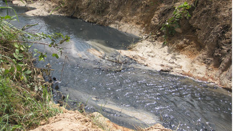 Dòng nước rỉ rác đen ngòm từ suối chảy vào kênh lớn và theo dòng chảy sẽ đổ về sông Dinh.
