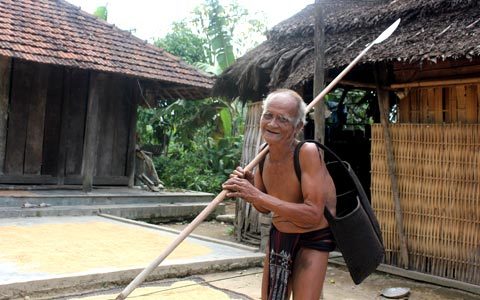 | Già làng Cơ Tu ở Thượng Long (Nam Đông, Thừa thiên Huế) trong trang phục và dụng cụ khi đi săn. Ảnh: Duy Tuấn |