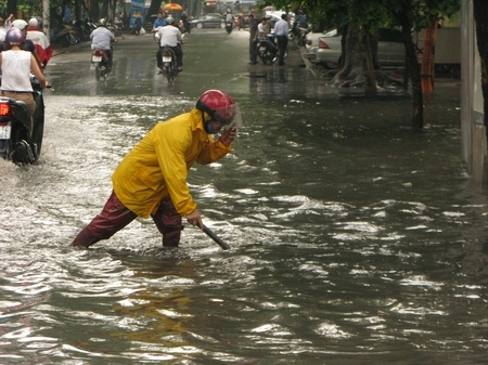 Công nhân Công ty Thoát nước trong biển nước (Nguồn ảnh: Vnmedia) |