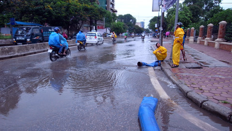 | Nhân viên Công ty Thoát nước Hà Nội đang bơm nước từ những đoạn đường bị ngập vào miệng cống trên đường Trường Trinh (Ảnh Phạm Hải) |