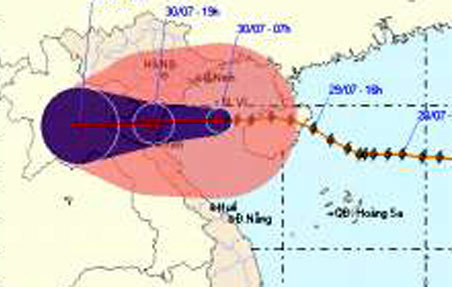 khoảng 230km Do ảnh hưởng của bão số 3 trạm đảo Cô Tô có gió mạnh 15m/s (cấp 7), giật 27m/s (cấp 10); ở trạm đảo Bạch Long Vĩ có gió mạnh 20m/s (cấp 8), giật 24m/s (cấp 9). Hồi 7 giờ ngày 30/7, vị trí tâm bão ở vào khoảng 19,5 độ Vĩ Bắc; 107,9 độ Kinh Đông, cách bờ biển Thái Bình - Hà Tĩnh khoảng 230km về phía Đông. Sức gió mạnh nhất vùng gần tâm bão mạnh cấp 9, cấp 10 (tức là từ 89 đến 102 km một giờ), giật cấp 11, cấp 12. Dự báo trong 12 giờ tới, bão di chuyển chủ yếu theo hướng Tây, mỗi giờ đi được khoảng 20 - 25km. Như vậy khoảng trưa nay (30/7) bão sẽ ảnh hưởng trực tiếp đến các tỉnh từ Quảng Ninh đến Hà Tĩnh. Đến 16 giờ ngày 30/7, vị trí tâm bão ở vào khoảng 19,4 độ Vĩ Bắc; 105,5 độ Kinh Đông, trên khu vực các tỉnh bắc Trung Bộ. Sức gió mạnh nhất vùng gần tâm bão mạnh cấp 8, cấp 9 (tức là từ 62 đến 88 km một giờ), giật cấp 10, cấp 11. Dự kiến sau khi đổ bộ lúc 4h chiều nay, bão số 3 tiếp tục di chuyển sâu vào bên trong đất liền và suy yếu thành một áp thấp. Ngày mai, áp thấp này sẽ suy yếu tiếp thành một vùng áp thấp trên biên giới Việt – Lào. Hiện nay, ở vịnh Bắc Bộ có gió mạnh cấp 8, vùng gần tâm bão đi qua cấp 9, cấp 10, giật cấp 11, cấp 12 và có mưa rào và dông mạnh. Biển động rất mạnh. Vùng ven biển các tỉnh từ Quảng Ninh đến Hà Tĩnh gió sẽ mạnh dần lên cấp 6, cấp 7, vùng gần tâm bão cấp 8, cấp 9, giật cấp 10, cấp 11. Các tỉnh Nam đồng bằng Bắc Bộ và bắc Trung Bộ gió sẽ mạnh dần lên cấp 6, có nơi cấp 7, giật cấp 8. Phía Đông Bắc Bộ và Bắc Trung Bộ có mưa vừa, mưa to, có nơi mưa rất to và rải rác có dông. Trong cơn dông cần đề phòng có lốc xoáy. Vùng ven biển các tỉnh từ Hải Phòng đến Nghệ An cần đề phòng nước biển dâng kết hợp với triều cường cao từ 3 - 5m. |