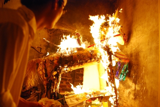 Đúng 12 giờ đêm, ngọn lửa xuất hiện ở ven sông Hồng, chỗ bãi cát của đại gia T. Đứng trên đê vẫn nhìn rõ ngọn lửa cháy đùng đùng vượt qua cả những ruộng ổi, rặng tre, vườn chuối. 1.000 ngựa - người, cả núi hàng mã, cùng hàng chục tỷ đô-la hàng mã đã bị ngọn lửa thiêu rụi.