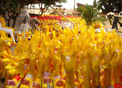 Để thực hiện được buổi cúng Vu Lan kỷ lục này, vị đại gia tên T. đánh xe chở một đội quân làm ngựa giấy, người giấy từ làng Đông Hồ về bãi cát nhà mình, rồi đêm ngủ ngày thức đóng khung, bọc giấy vẽ hình người - ngựa cho thật đẹp.
