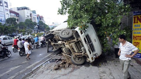 Chiếc xe chỉ chịu dừng lại khi húc đổ 2 cây hoa sữa có đường kính khoảng 20cm và đâm gẫy một cột điện.