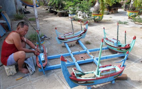 Ông Thẩn đang sửa chữa những chiếc ghe mô hình |