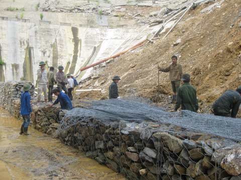 Phía dưới, hàng chục công nhân đang tích cực lấy đá sạt lở tại chỗ để kè bằng rào chắn lưới thép B40.