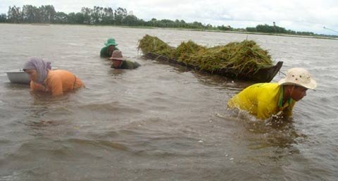 Người dân ấp Bưng Ràm, xã Hưng Điền B, huyện Tân Hưng (Long An) mò cắt lúa chạy lũ. (Ảnh: Tuổi trẻ) |