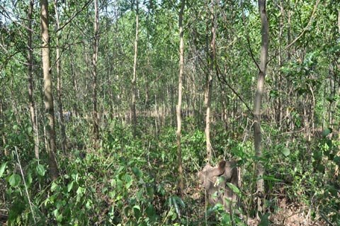 | Trong lòng tháp cổ Phật viện Đồng Dương bây giờ là rừng keo lá tràm mọc ken dày |