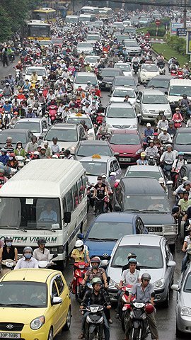 | Ô tô đi hàng hàng 4,5 vào giờ cao điểm - Ảnh: Phạm Hải |