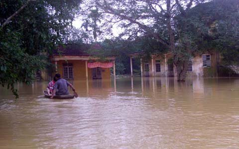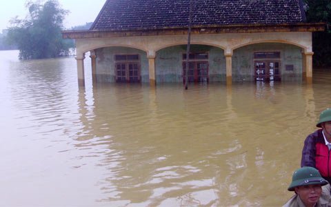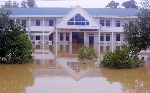 | Mưa lũ tại xã Phương Mỹ đã gây ngập lụt nghiêm trọng, hàng trăm nhà dân, trụ sở UBND xã, trường học chìm trong biển nước. |