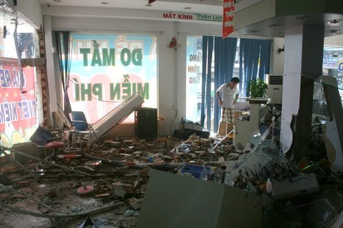 Tại hiện trường, sau khi xe tải được kéo đi để lại một đống đổ nát. Kính cửa vỡ vụn. Tủ kính, kính đeo mắt, nhiều thiết bị phục vụ ngành kính và vật dụng trong gia đình gãy đổ văng tung tóe.