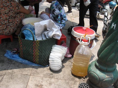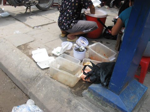 Đang băn khoăn với suy nghĩ “nếu họ cứ gánh hàng đi như vậy thì họ lấy nước đâu để rửa bát, đĩa, chén cốc? Tôi liền tò mò theo dõi và thật sửng sốt khi thấy khách ăn xong, bát đĩa được để tràn lan vào một góc.