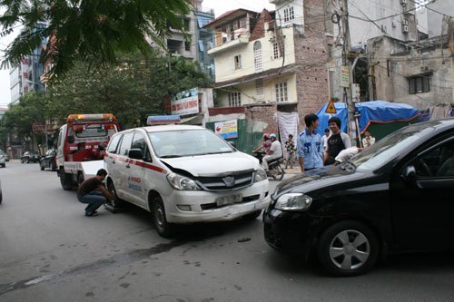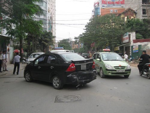 Sau khi đè nát hai chiếc xe máy, “xe điên” lao rất nhanh và đâm mạnh vào đuôi xe ô tô Gentra BKS: 30P-09.. chạy cùng chiều khiến chiếc ô tô này mất lái, lạng sang bên kia đường và đâm vào chiếc taxi 7 chỗ của hãng taxi Hà Nội BKS 30R-98...