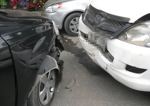 Chiếc ô tô Gentra do bị đâm thẳng vào đuôi xe khiến cốp xe bị móp méo và biến dạng, phần đầu xe do va chạm mạnh với chiếc taxi nên cả hai đầu xe cũng đều bị biến dạng.