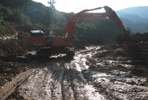 Tay tài xế “xe ôm công vụ” tên Dũng được huyện điều động đưa tôi đi. Dũng bắt đầu chuyến hành trình vừa dắt vừa đẩy xe qua những đống đất đá hàng nghìn m3 đổ ập xuống con đường Nam Quảng Nam dài hơn 35 km và mất hơn 4 giờ đồng hồ.