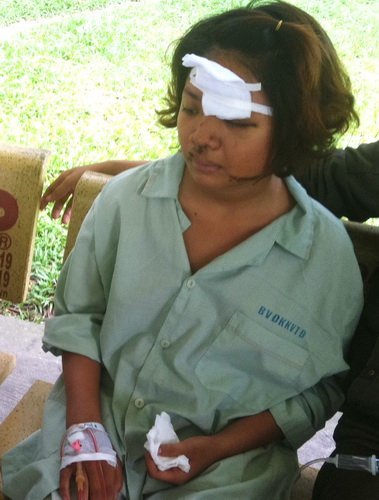 bệnh nhân nữ còn rất trẻ ngồi trầm tư. Một vết thương trên trán đang còn băng