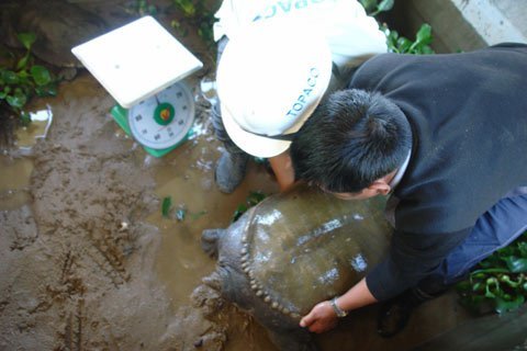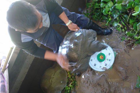 Một chiếc cân bàn 100kg được đưa vào trong chuồng. Anh Hải dù khỏe mạnh nhưng cũng loay hoay không sao nhấc được con ba ba khổng lồ lên khỏi mặt đất. Con ba ba nhỏ mau chóng được đưa lên bàn cân một cách gọn nhẹ: tròn 20kg.