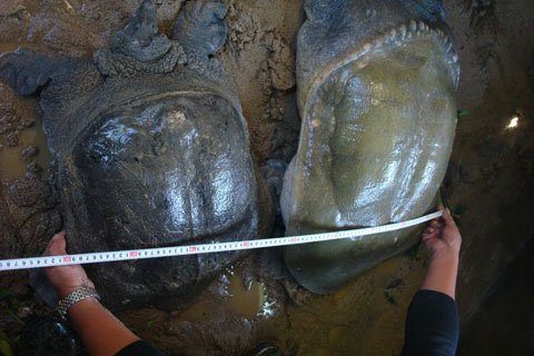 | Chiếc đầu của con ba ba khổng lồ... - Ảnh: Kiên Trung |