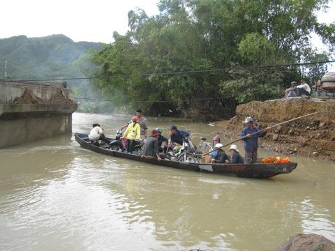 | Nước lũ cuốn trôi hai bên mố cầu cầu sông Cô đang xây dựng người dân đi bằng đò |