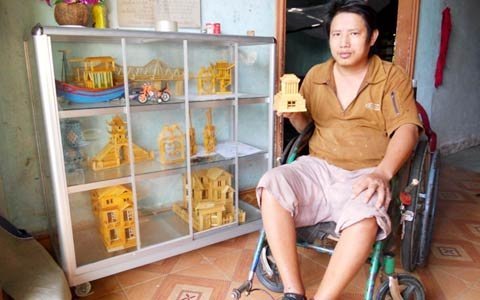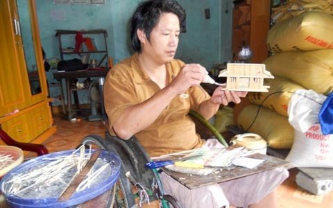Chúng tôi tìm đến nhà anh Hóa khi anh còn say sưa, tỉ mẩn ngồi trên chiếc xe lăn cắt cắt, dán dán, ngắm nghía “ngôi nhà” Bác Hồ làm bằng tăm tre của mình đang sắp hoàn thành.