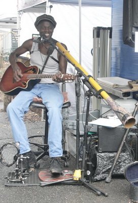 nhiều người chú ý, gian hàng của một nhạc sĩ kiêm ca sĩ da màu bày bán đĩa CD và