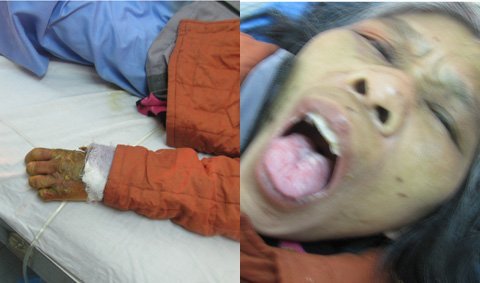 Bệnh nhân nhập viện lúc 17h ngày 5/1, trong tình tạng tỉnh, vùng mặt sưng tím, ngực phải có các vết bầm tím rộng 20,5cm, chân sưng phù, toàn bộ vùng da từ bụng xuống phần kín, mông bị bỏng nặng