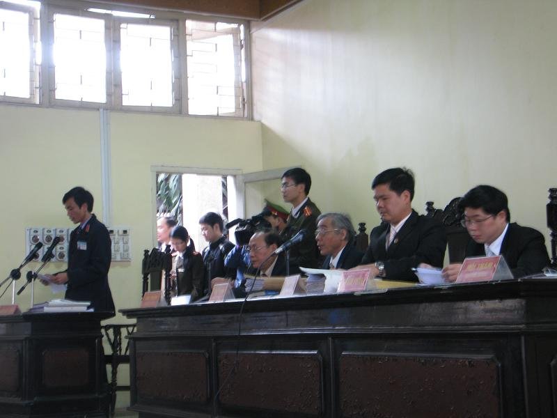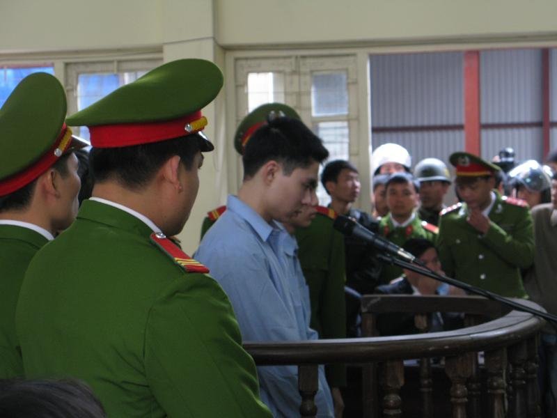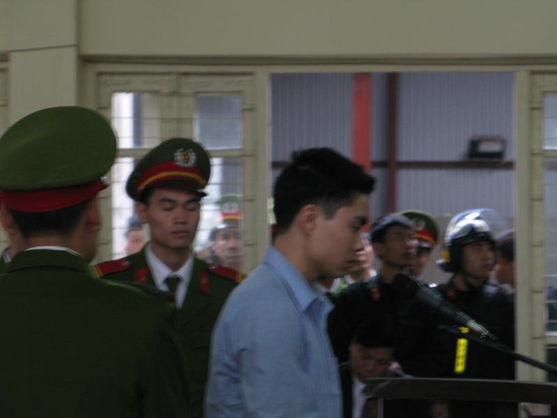 Đưa bị cáo ra trước vành móng ngựa. Vây xung quanh là các cảnh sát bảo vệ tư pháp để bảo vệ bị cáo khỏi sự phản ứng của người nhà nạn nhân