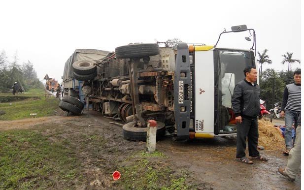 Tại hiện trường, chiếc xe tải BKS 49H – 7069 bị lật ngay bên taluy phải theo hướng Nam – Bắc.