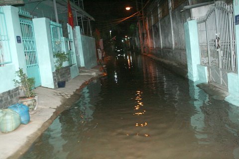 Đang mồng 2 tết nhưng đường số 7 khu phố 5 (P. Hiệp Bình Phước, Q. Thủ Đức TP.HCM) hoàn toàn vắng lặng, không một người qua lại. Trên mặt đường nước bắt đầu dâng cao . . .