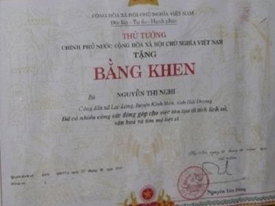 Bà Nguyễn Thị Nghi mới đây đã vinh dự đón nhận Bằng khen của Thủ tướng Chính phủ vì đã có nhiều công sức đóng góp cho việc tôn tạo di tích lịch sử văn hóa và tìm mộ liệt sĩ sau khi tỉnh Hải Dương đề nghị trao Bằng khen cho bà.