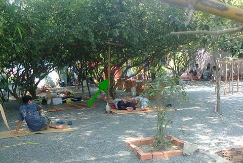 Khi chúng tôi đến, trong nhà có khoảng 10 người đang ngồi tọa thiền mặc định. Cạnh ngôi nhà, trên vuông đất rộng khoảng 200m2 lát gạch tàu, hàng trăm người nằm la liệt.