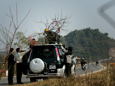 | Không chỉ tiện thể đi công tác mà nhiều người đánh cả xe con lên Mộc Châu mua đào rừng về chơi tết - Ảnh: Lê Anh Dũng |
