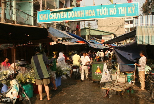 Chúng tôi có mặt tại chợ hoa Hồ Thị Kỷ lúc 16g chiều 30 tết. Nếu chỉ hôm qua thôi, con đường dẫn vào chợ dài hơn 300m đã nghẹt người thì nay đã trống hẳn. Chợ hoa Hồ Thị Kỷ là chợ đầu mối hoa duy nhất tại thành phố. Hầu hết hoa Đà Lạt, hoa của các nhà vườn, hoa miền Bắc đều tập trung về đây rồi từ đây lan tỏa ra khắp thành phố. Vậy mà, chiều 30 tết, lượng người đến đây thưa thớt. Hầu hết họ là những khách hàng mua lẻ và các vựa hoa đã chẻ hoa ra thành từng bó nhỏ để bán.