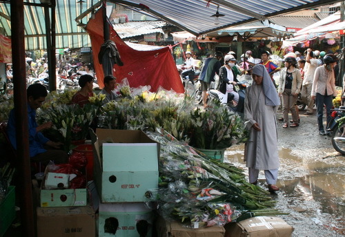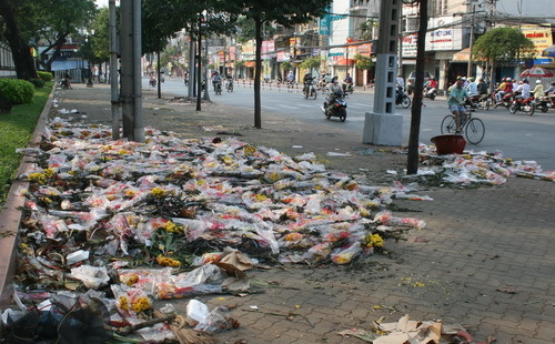 Từ chợ Hồ Thị Kỷ trở ra đường Lý Thái Tổ, con đường trước đây vài ngày người buôn bán hoa lẽ ngồi dọc hai bên đường nhưng nay đã vắng. Dấu tích còn để lại là một đống rác hoa to tướng trên lề đường bên hông nhà khách chính phủ. Thì ra hoa năm nay có lúc cũng không bán được đành phải đổ bỏ...