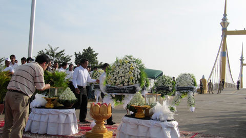 | Từ 9h30 phút, đã có rất nhiều người kéo đến bờ sông gần cầu Koh Pich tham gia tưởng niệm các nạn nhân, buộc cảnh sát phải kéo dây phong tỏa khu này đảm bảo an tòan cho người dân |