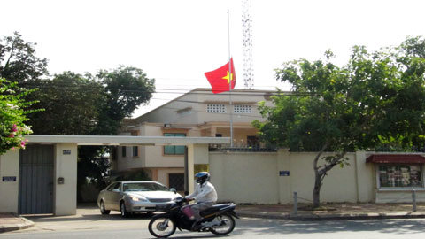| Quốc kỳ Việt Nam tại ĐSQ Việt Nam ở Campuchia cũng treo cờ thấp |