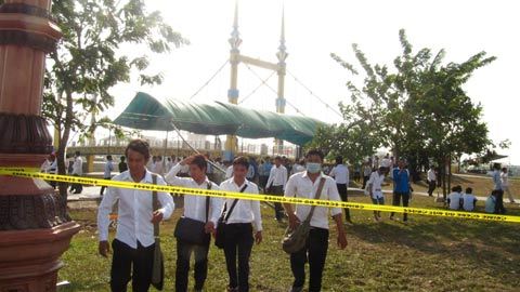 | Dư luận cho rằng nhiều người chết vì điện giật khi cố gắng leo qua lan can cầu nhưng giới chức Campuchia bác bỏ thông tin này. |