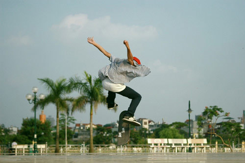 Lướt nhanh trên mặt đất, lượn lách tránh chướng ngại vật, nhún người nhảy lên chiếc ván trượt xoay một vòng trên không trung rồi tiếp... Môn trượt ván với những động tác mạo hiểm thử độ gan lì của người chơi đang rất hút các bạn trẻ.