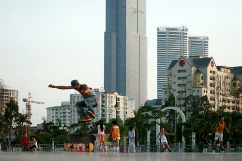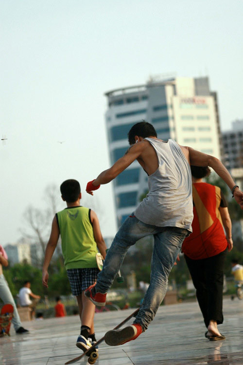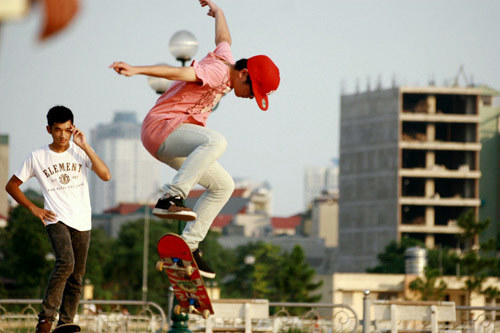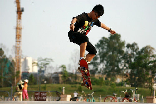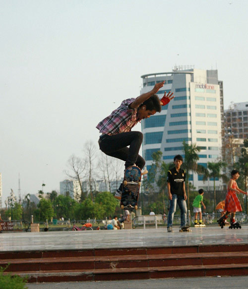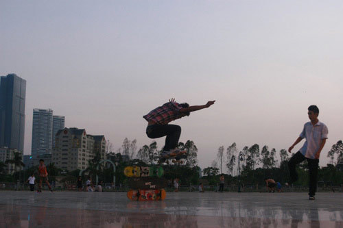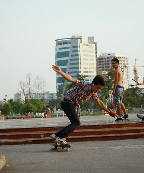 Có mặt tại công viên Vầng Trăng – Cầu Giấy, chúng tôi đã thực sự bị cuốn hút với những pha trượt ván điệu luyện của các bạn trẻ: