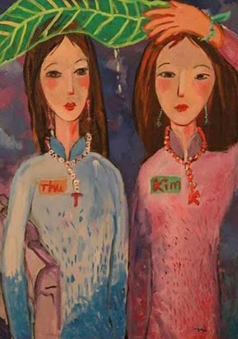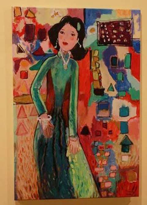 | Bên cạnh những tác phẩm liên quan tới cuộc sống trẻ thơ của mình tại Sydney, Jacquelyn Ngô còn vẽ không ít những hình ảnh quen thuộc của Việt Nam như áo dài dân tộc hay nhạc cụ truyền thống. |