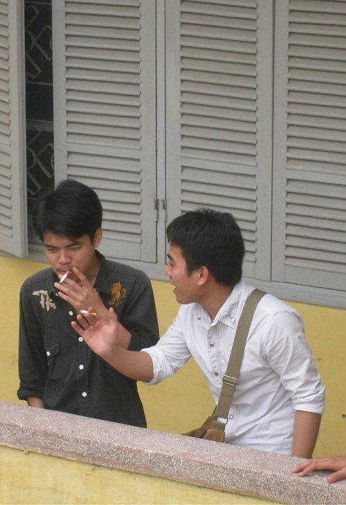 | Sinh viên hồn nhiên châm thuốc hút phì phèo tại hành lang giảng đường ĐHKHXH&NV. |