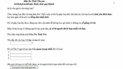 “Chào mừng bạn đến với máy tình yêu! Chiếc máy sẽ trả lời giúp bạn tình cảm hiện tại của bạn là một tình yêu thực thụ hay đơn giản chỉ là một sự ham muốn nhất thời. Nó sẽ giúp bạn tìm được đúng mục tiêu của mình để không bao giờ phải có những sự cố gắng vô ích. Máy sẽ tìm trong số những người bạn quan tâm, ai sẽ là người thích hợp nhất với bạn”. Kèm với những lời quảng cáo đầy hấp dẫn trên là những yêu cầu điền họ tên đầy đủ của bản thân với họ tên đầy đủ của những người mà bản thân cảm thấy quan trọng nhất.