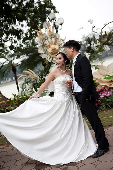 Nhiều đôi uyên ương cũng tranh thủ lưu lại những bức ảnh cưới đẹp đúng dịp lễ hội phố hoa. (Ảnh Lao Động) |