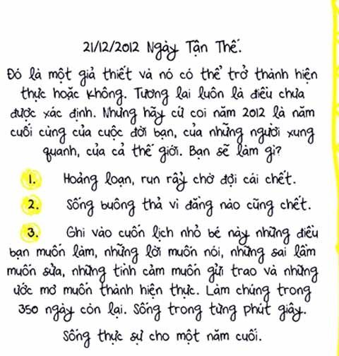 Tờ lịch ngày 21/12/2012 in đậm lời nhắn ý nghĩa: “Hãy nắm tay nhau nếu đây là ngày cuối”.