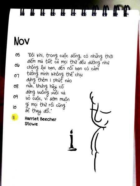 Cuốn lịch lay động lòng người ngay từ trang đầu tiên khi nhóm thiết kế lựa chọn câu nói của “phù thủy” trứ danh Steve Jobs: “Nghĩ rằng mình sẽ sớm chết là công cụ quan trọng nhất giúp tôi tạo ra những quyết định lớn trong đời. Vì gần như mọi thứ, từ những kì vọng của người khác, sự kiêu hãnh, nỗi sợ hãi thất bại, sẽ biến mất khi bạn phải đối mặt với cái chết, chỉ còn lại điều thực sự quan trọng với bạn. Nghĩ rằng mình sắp chết là cách tốt nhất tránh rơi vào bẫy rằng bạn sẽ mất cái gì đó”.