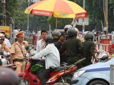 Cảnh sát hình sự hóa trang (áo xanh) tiến hành kiểm tra dưới sự hỗ trợ của CSGT.